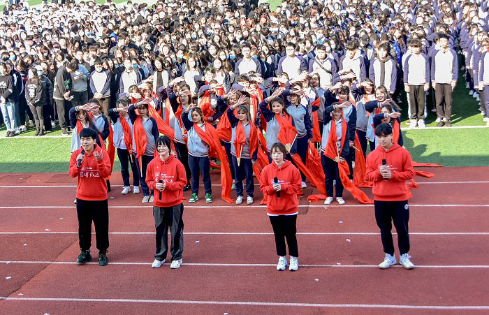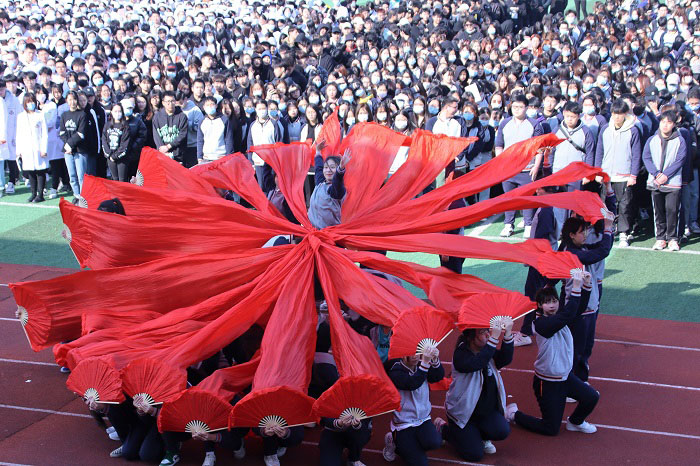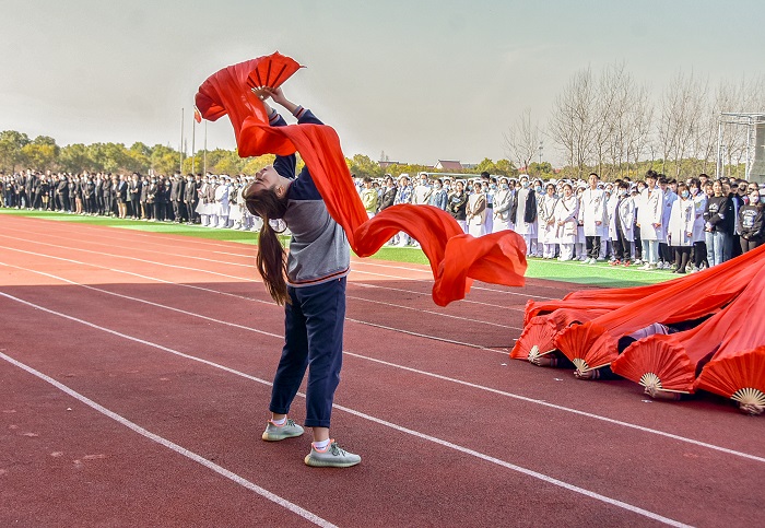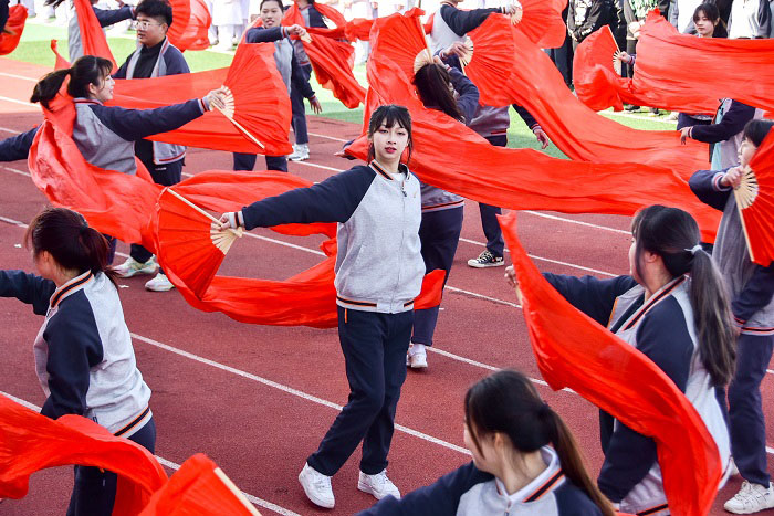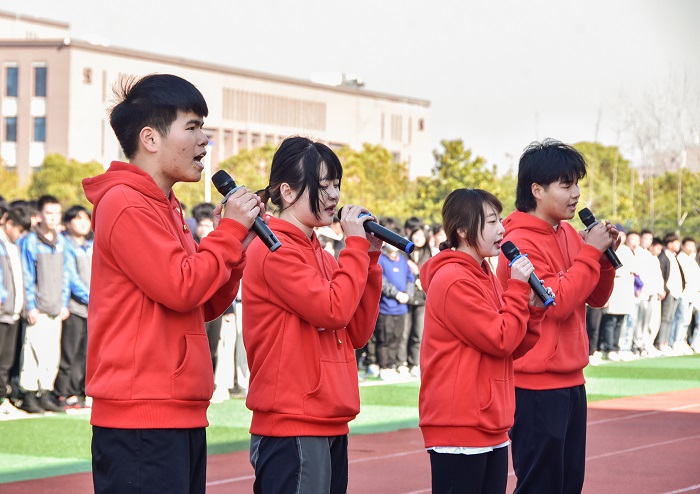 英姿飒爽的国旗队迈着坚定的步伐走向升旗台,雄壮的国歌响起,鲜艳的五星红旗在空中冉冉升起,激荡着每一位学子的心灵。“唱支山歌给党听,我把党来比母亲……”伴随着清脆悦耳的女声响起,青春快闪表演开始,一首《唱支山歌给党听》的选段独唱,一场《红色摇篮》的红色丝绸舞剧幕,一首《站起来》的欢快合唱,精彩的歌舞快闪唱出了对党的深深挚爱,舞出了红色革命的坚定和勇敢,展现了学子青春向上的奋斗热情,带给全场师生深深的震撼。