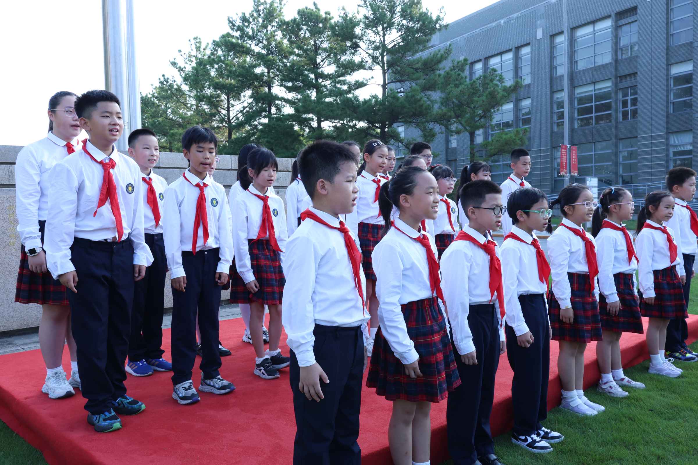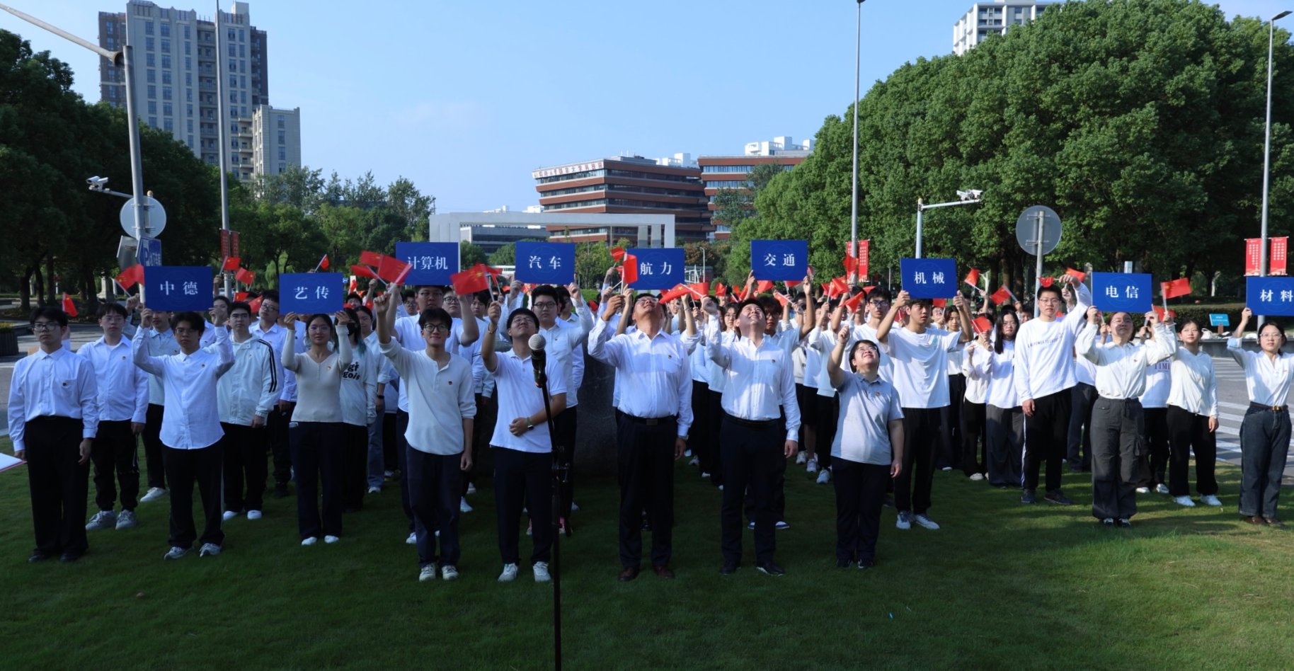 全体师生挥舞小红旗 此次升旗仪式,既是对新中国成立76周年的深情献礼,也是对中国人民抗日战争暨世界反法西斯战争胜利80周年的隆重纪念,更是学校深化大中小学思政教育一体化、共育时代新人的重要举措。新学期,这一庄严的接力棒将传递至嘉定校区各学院,通过轮流承办升旗仪式,打造常态化、品牌化的爱国主义教育平台,让升旗台成为思政教育的生动课堂,让爱国主义的种子在青年心中生根发芽、茁壮成长,引导广大青年在回望历史中汲取力量,在展望未来中明确方向,奋力书写为中国式现代化挺膺担当的青春篇章!