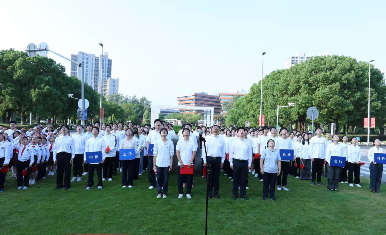 全体师生行注目礼 同济大学嘉定校区管理委员会办公室主任周斌,校团委副书记余清泉,同济大学派驻基础教育集团专职干部、同济大学附属实验中学附属党总支书记林秋琴,以及来自嘉定基础教育集团的师生代表、各学院师生代表和青马工程第八届“殷夫班”学员等百余人参加。本次活动由共青团同济大学嘉定校区工作委员会主办,党委宣传部、嘉定校区管理委员会办公室、嘉定基础教育集团协办。