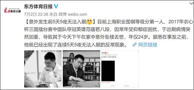 昨天晚间,上海棋院、上海市围棋协会发布讣告称:7月2日下午1时许,著名围棋职业棋手范蕴若不幸从家中坠楼身亡,生前被查出患有抑郁症。