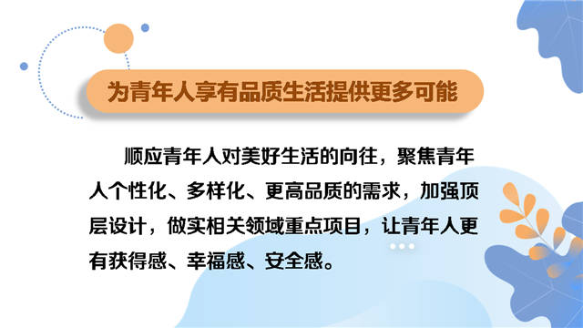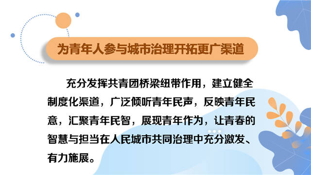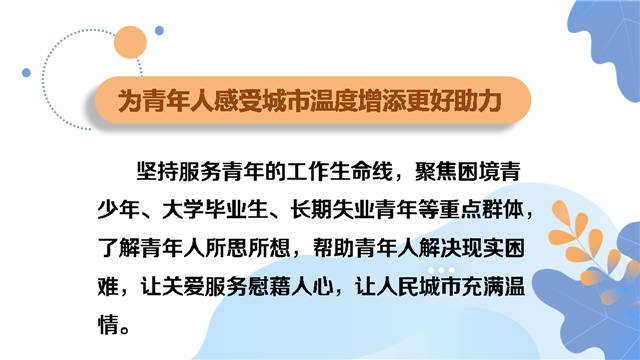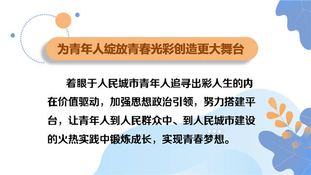 《实施意见》对标“人人都有人生出彩机会、人人都能有序参与治理、人人都能享有品质生活、人人都能切实感受温度、人人都能拥有归属认同”这“五个人人”目标要求,提出“五个为”的努力方向——为青年人绽放青春光彩创造更大舞台,为青年人参与城市治理开拓更广渠道,为青年人享有品质生活提供更多可能,为青年人感受城市温度增添更好助力,为青年人拥有归属认同汇聚更强共识。