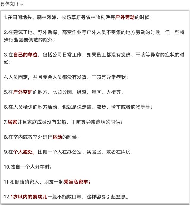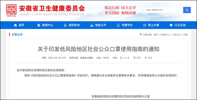 3月16日,安徽省发布《低风险地区社会公众口罩使用指南》。《指南》对7种非必需佩戴口罩的情形和13种需要戴口罩的情形进行了规定。