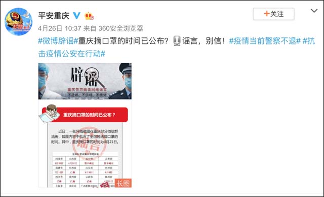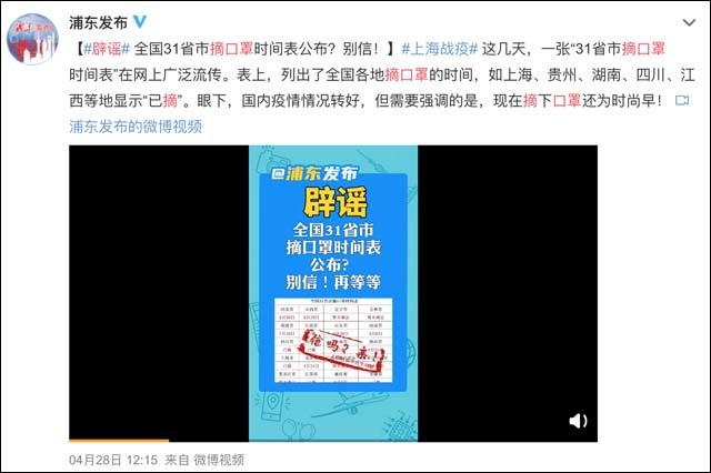 近日,重庆市公安局官方账号@平安重庆 、上海市浦东新区人民政府新闻办公室官方微博@浦东发布 都对此说法进行了辟谣:现在摘口罩为时尚早!疫情期间,市民应以权威发布的信息为准。
